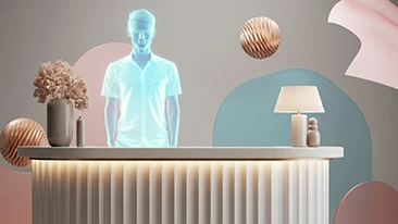 Hospitality: digitale interactieve holografische mens verwelkomt de mensen op een unieke manier.